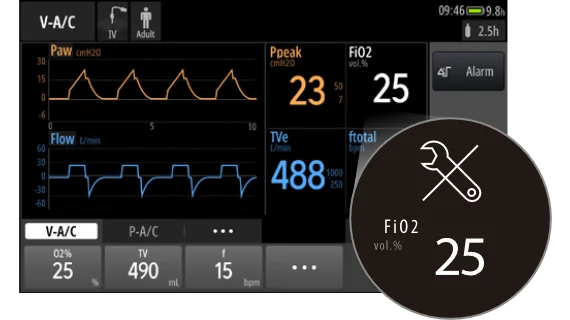 - Точная регулировка FiO2 в диапазоне от 21% до 100%