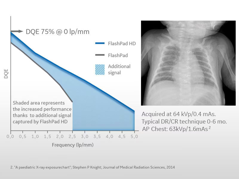 Детекторы FlashPad HD позволяют увеличить количество пикселей на площади в четыре раза, что гарантирует получение четких рентгеновских изображений и обеспечивает высокую степень детализации анатомических структур при низкой дозе облучения. Доступны размеры 10 x 12 дюймов и 14 x 17 дюймов, что соответствует стандартным кассетам.