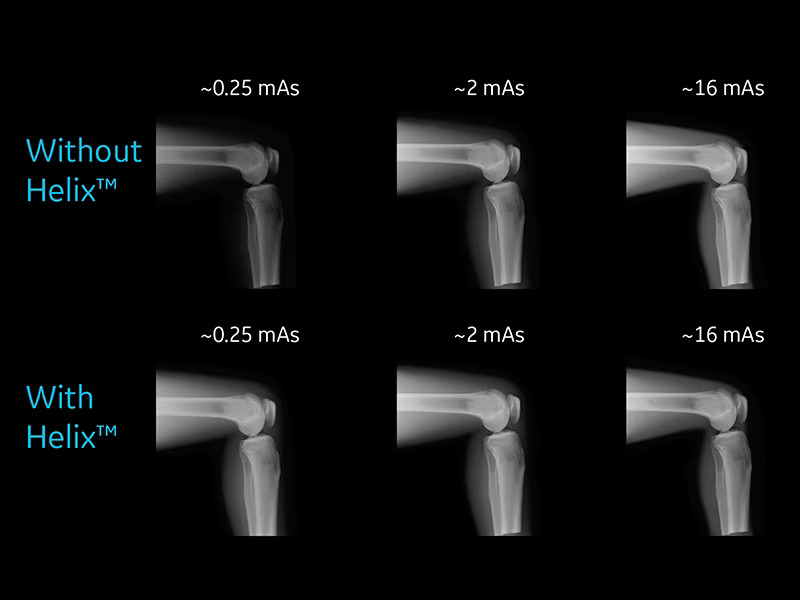 За счет алгоритма интеллектуальной настройки уровней яркости и контрастности, а также усовершенствованной функции восстановления контрастности технология Helix обеспечивает стабильность этих параметров независимо от дозы облучения.