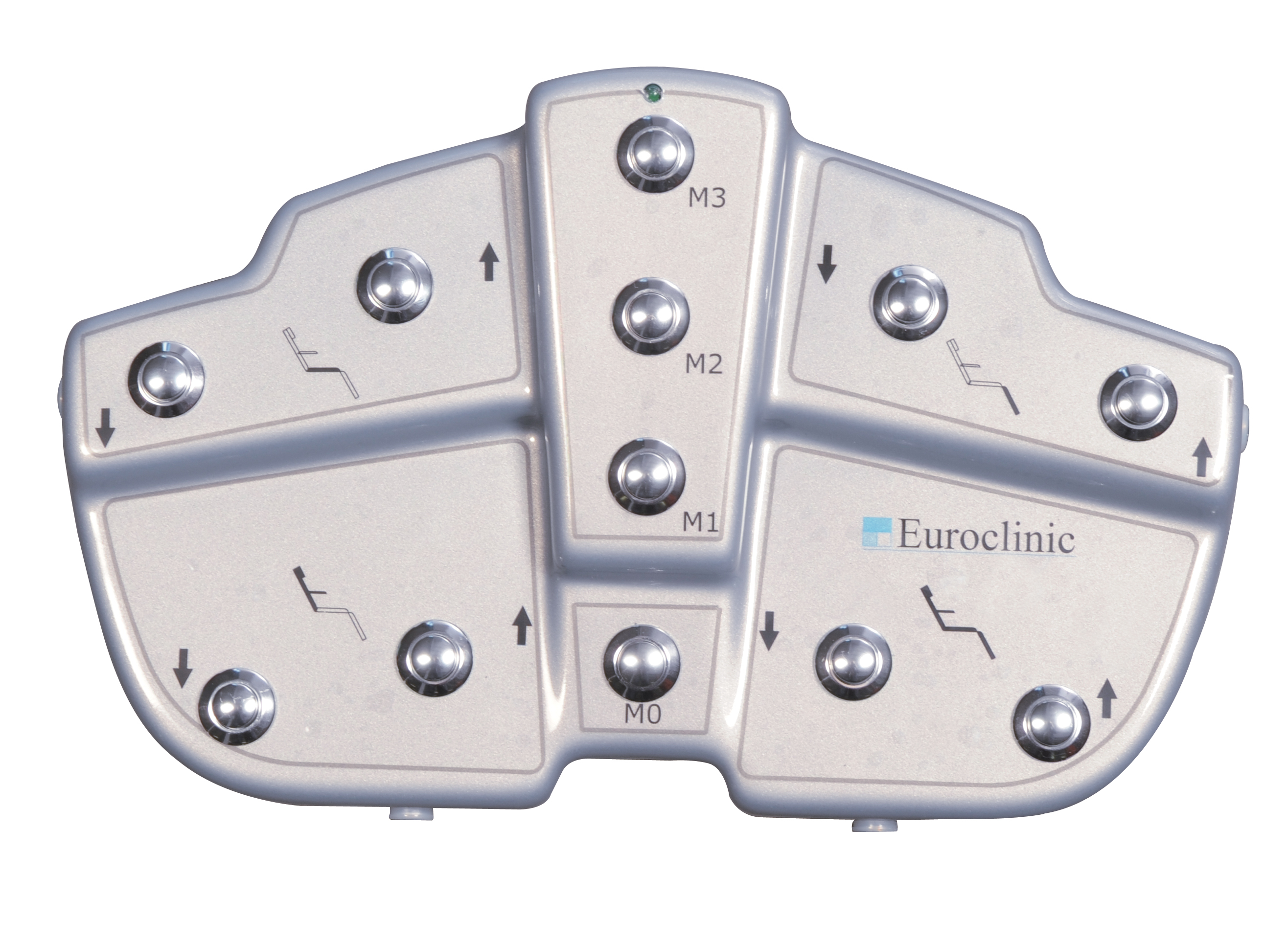 • Управление с помощью беспроводной педали с функцией памяти — врач может самостоятельно внести ту конфигурацию, которую хочет запомнить, и использовать единственное нажатие кнопки для перевода кресла в это положение. Запоминается до трех позиций, кнопки выделены в центральной части педальной панели. Четвертая кнопка выводит кресло в позицию «покой»;