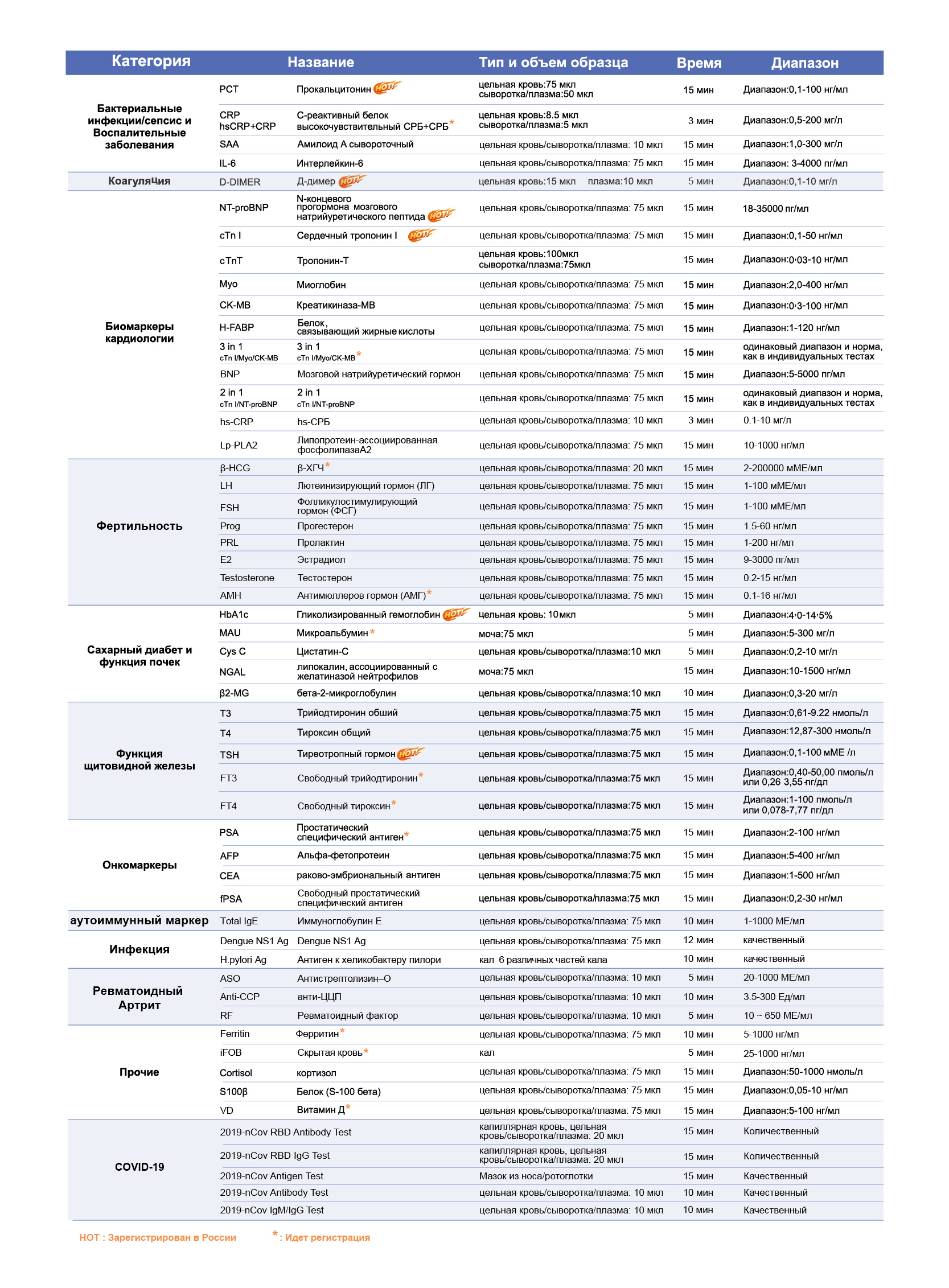 Тип: Полуавтоматический Производительность, тестов/час: 20 Реагенты: Тест-катридж Тип исследуемого образца: Цельная кровь, Плазма Размеры (Ш×В×Г), мм: 238х146х270