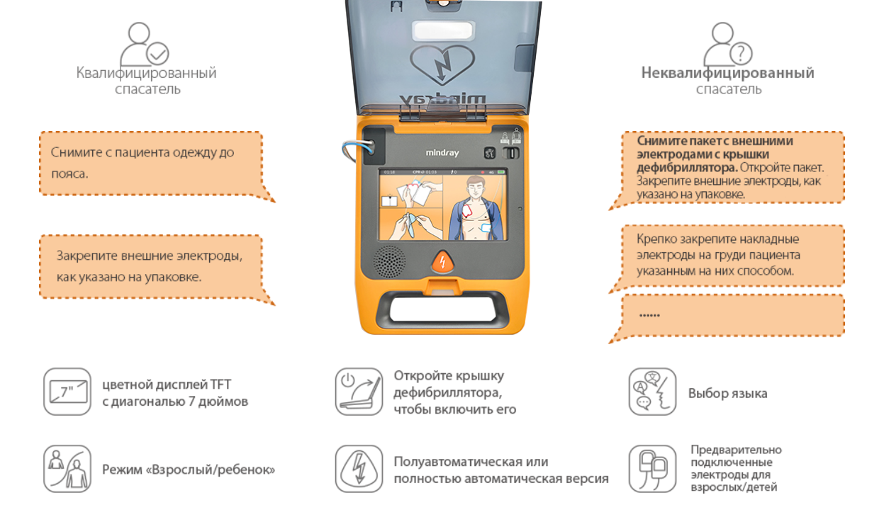 • Голосовые подсказки по проведению реанимационных действий на русском языке;