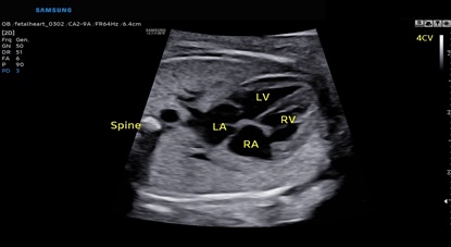 на изображении: Цветная допплерография с LumiFlowTM (4-камерный вид)