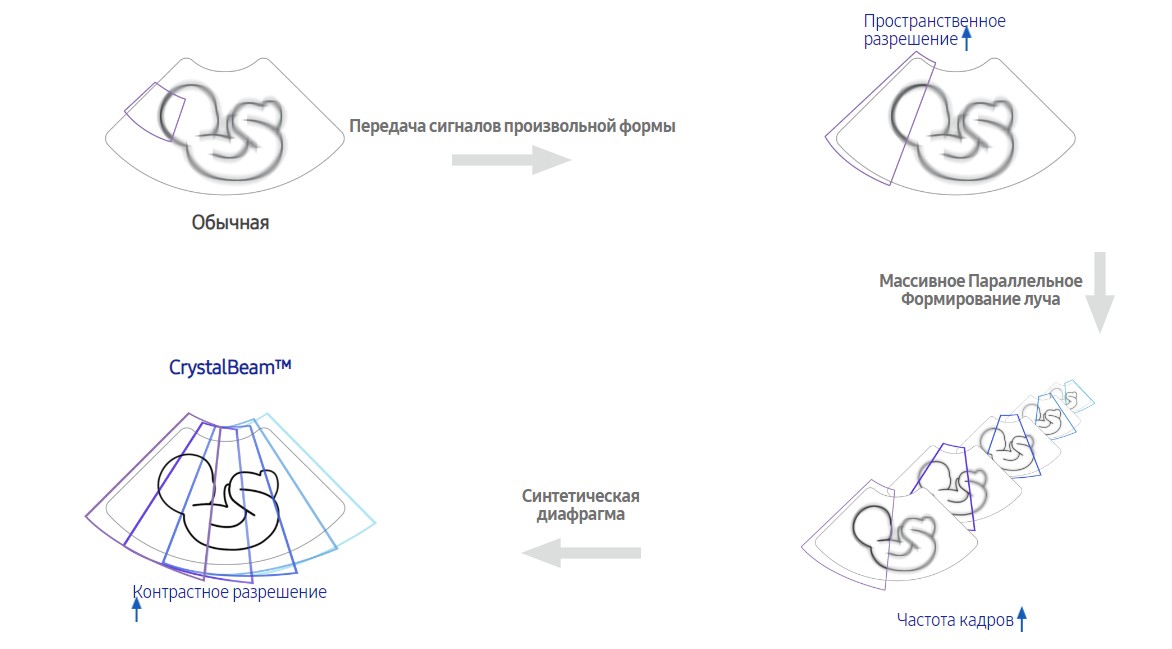 CrystalBeam ™ использует передачу сигналов произвольной формы, массивное параллельное формирование луча и технологии синтетической диафрагмы для повышения частоты кадров и улучшения однородности изображения.