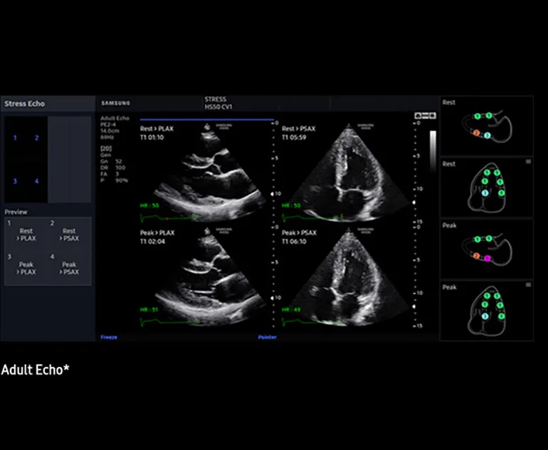 Пакет StressEcho включает в себя оценку движения стенок и составление отчётов. Он включает в себя StressEcho при физических нагрузках, фармакологический StressEcho, диастолический StressEcho и программируемый пользователем StressEcho.
